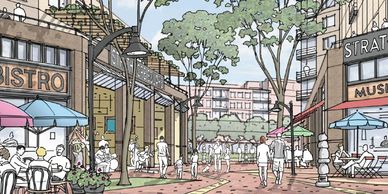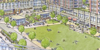Strathmore Square plans feature a gathering place at the center of the site for the neighborhood and the existing communities nearby so that Strathmore Square can become an active gathering place for everyone. Our vision for the Civic Green would provide the potential for bistros, small retail amenities and classrooms that open into the square.